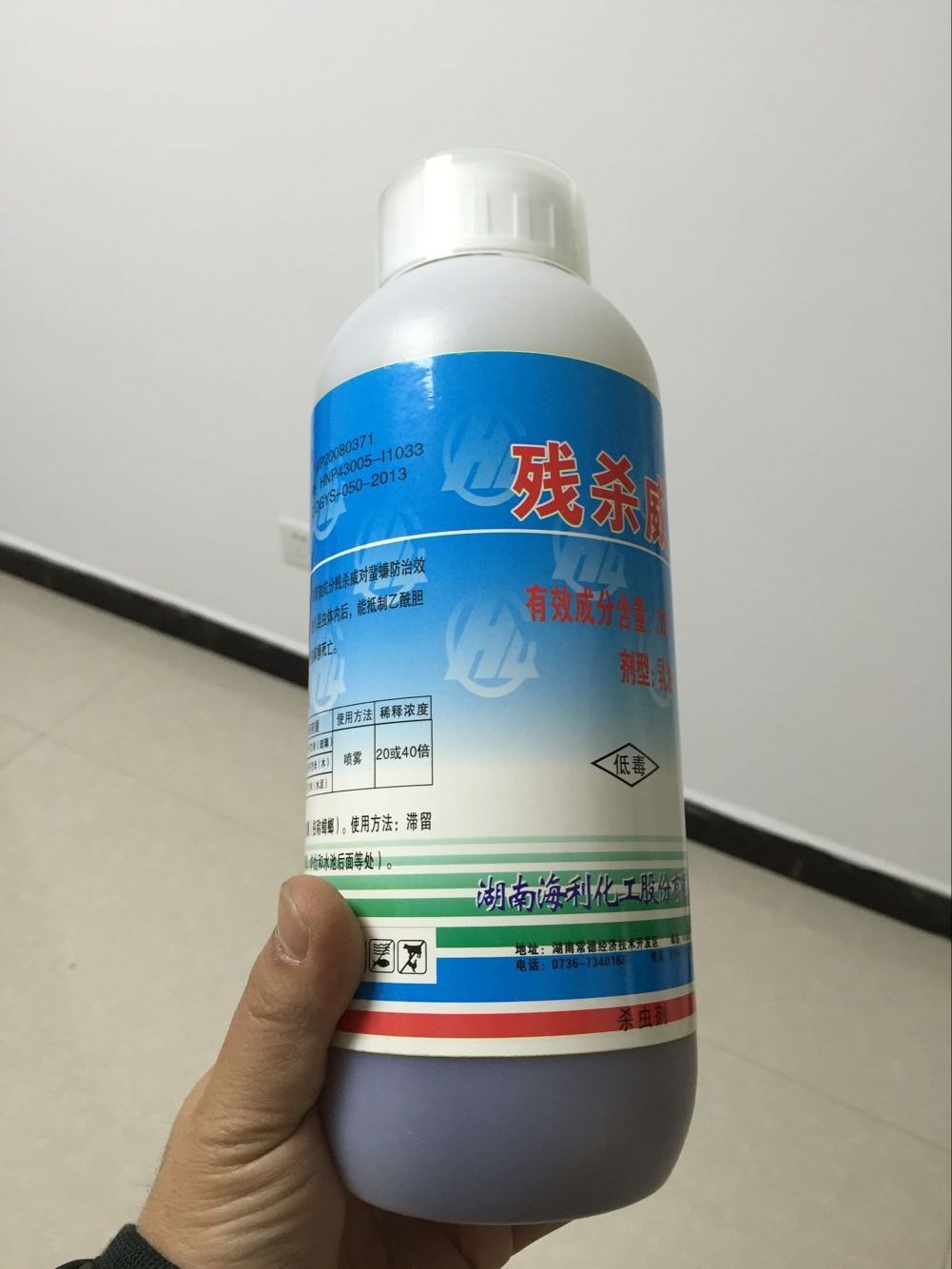 20%海利残杀威乳油 有效成分及含量:20%残杀威 农药登记证号:WP2008371 生产批准号:HNP 43005-I1033 产品标准号:Q/OGYS-50-2008 产品包装:1000毫升/瓶 10瓶/箱 有 效 期:二年 ◆产品性能: 本品系氨基甲酸酯类杀虫剂,其有效成分残杀威对蜚蠊防治效果好,具有触杀和熏蒸作用,进入昆虫体内后,能抵制乙酰胆碱酯酶的活性,阻止神经传导,使昆虫麻痹死亡。广泛用于家庭内外、宾馆、餐厅、工厂、仓库、火车、轮船、飞机、农场等处防治卫生害虫。 ◆使用技术和使用方法: 作 物 防治对象 制剂用药量 使用方法 卫 生 蜚蠊 (蟑螂) 1.25-2.5克/平方米(玻璃) 喷 雾 2.5-3.75克/平方米(木) 5-7.5克/平方米(水泥) 量取残杀威20%乳油125毫升,对水至5升,(20-40倍稀释),滞留喷洒于室内蟑螂隐蔽场所(墙缝、墙脚、炉灶和水池后面等处)。 ◆注意事项: ●在碱性介中易分解。应避免与碱性物质混用。 ●本品易燃,应将本品存放在阴凉干燥处,远离火源。 ●施用本品后应立即洗手和洗脸。 ●使用后通风,切勿向人体、食物喷洒。 ●过敏者禁用,使用中有任何不良反应请及时就医。 ◆中毒急救: 若中毒,应将病人移至空气流通处,并立即就医。可服阿托品解毒。 ◆贮存和运输: 本品应贮存在干燥、阴凉、通风、防雨处,远离火源或热源。置于儿童触及不到之处,加锁。勿与食品、饮料、饲料、种子及易燃爆品等其他商品同贮同运。用过的容器应妥善处理,不可做他用,也不可随意丢弃。