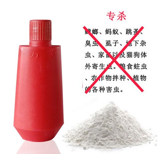 1灭跳蚤臭虫螨虫等小虫,用手轻轻挤压和抖动,将药粉均匀喷洒至害虫活动栖息的地方,薄薄一层即可。施药后药粉尽量别檫去,以保持长效,并可防治外来害虫入侵。 如须大面积施药时,可配合使用喷粉机喷洒。 2、灭蟑螂蜈蚣:此药可施于屋角、餐柜、衣柜、抽屉、杂物堆内,墙壁缝隙、下水道四周及楼道垃圾箱内外等处;全面施药后,数日内大小蟑螂等害虫会自动爬出死去,死光为止;一个月后卵荚中孵出的小蟑螂也会死光。